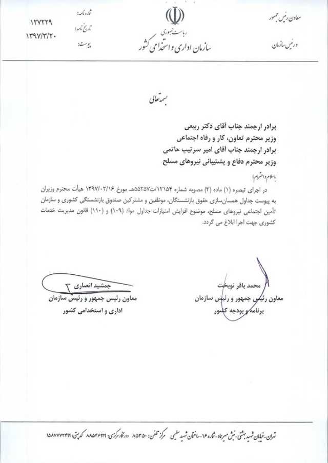 ابلاغ جداول گروه های شغلی بازنشستگان افزایش امتیازات کارمندان و نیروهای مسلح